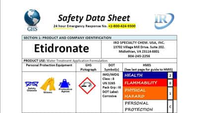 Shandong IRO Water Treatment Co., Ltd provides the following safety data sheets related to the hazardous properties of HEDP or etidronate products.